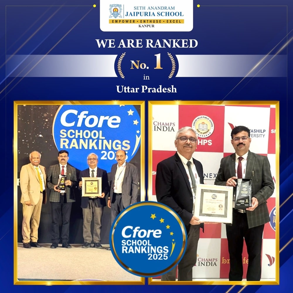 Ranked No.1 in Uttar Pradesh, We are delighted to announce that Seth Anandram Jaipuria School, Kanpur has been awarded the prestigious title of Uttar Pradesh No. 1 School at the CFore School Rankings 2025. The glittering ceremony held in New Delhi witnessed our Principal, Mr. Ganesh Tiwari, and Mr. Harish Sanduja, Director Schools and IT, Jaipuria Group, proudly receiving the honour from Mr. Premchand Palety, Founder of CFore. This recognition is a testament to our unwavering commitment to excellence in education, innovation, and holistic development of our students.