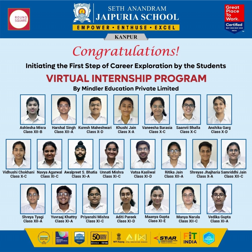 To make our students familiar with the 21st century career so that they can take an informed decision , SAJS Kanpur in association with Mindler has launched Virtual Internship program in which 22 Students of our school have successfully completed and were awarded with certificates of virtual internship in different fields of Medicine, Architecture, Psychology, Film-making, Ethical Hacking, Family business, Computer Science, Finance, Aviation,Law , Fund management ,etc. This program helped in exploring their chosen career in depth under the guidance of a professional mentor from the Mindler team. Students have completed the certification program enthusiastically and found it to be very useful. We wish good luck and success to all the successful students in their future endeavours.